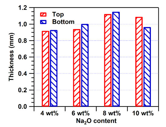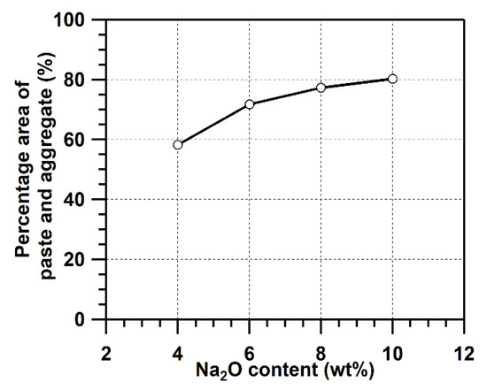 The average thickness of paste firstly increased with the water glass content and reached the maximum of approximately 1.1 mm at 8 wt% Na2O content, and then decreased slightly at 10 wt% Na2O content (Figure 15). For all mixes, the thickness of paste on the coarse aggregate ranged from 0.919 mm to 1.151 mm, indicating the similar average thickness of paste on the surface of aggregate. A previous study by Jang indicated that the average paste thickness on the surface of coarse aggregate was in the range of 1.08–1.29 mm for pervious concrete prepared with Portland cement and 0.63–4.31 mm for those with geopolymer by analysis under optical microscope under 35× magnification [34]. The results obtained in this study had a narrow range of distribution for paste thickness.
