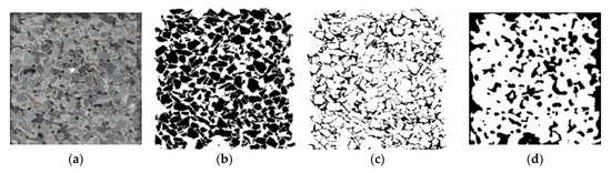 Typical analysis of mesostructure on the pervious concrete with 8 wt% Na2O as water glass content. The side length of images is 100 mm. (a) Optical image and binary images of (b) aggregate, (c) paste and (d) pore.