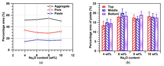 The distribution of paste on the top, middle and bottom of vertically cut surface of pervious concrete was evaluated (Figure 14b). With the increase in water glass content, so as to the fluidity according to Figure 10a, firstly the middle areas were the highest percent areas and increased with the water glass content (4 wt% and 6 wt% Na2O content), then the bottom area was the highest percent area of paste due to the increased fluidity, resulting in more sedimentation (8 wt% Na2O content) as seen in Figure 10 and Figure 12. For 10 wt% Na2O content, the percent areas of paste on the top and middle were similar and that on the bottom was slightly lower because of the decrease in fluidity and increase in viscosity and shear stress of fresh paste according to the results from rheology of paste.