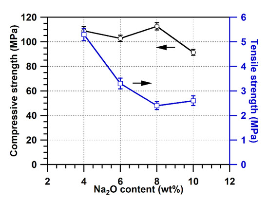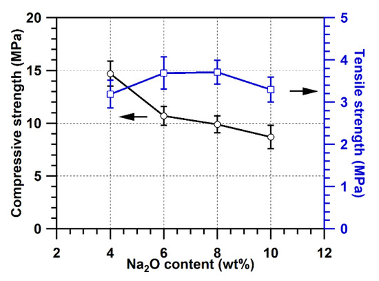 The compressive strength and tensile strength of alkali-activated slag prepared with different water glass content (as alkali equivalent) at 28 days are shown in Figure 16. The paste with 8 wt% Na2O content had the highest compressive strength at 28 days, followed by those with 4 wt%, 6 wt% and 10 wt% Na2O content. The tensile strength decreased with the increase in Na2O content. The reason could be due to the excess amount of SiO2 from the overdosed water glass at high water glass content. The mechanical properties of alkali-activated slag could reach the maximum when the optimum Si/Al was satisfied [54]. Either higher or lower Si/Al could result in lower mechanical properties. Another reason could be that the high water glass content resulted in the high OH− concentration in the paste, which in turn resulted in the thicker layer of calcium hydroxide formation on the surface of slag particles, preventing further resolution of slag particles and the formation of more hydration products [32,55,56]. These two reasons resulted in the decrease in mechanical properties of alkali-activated slag with higher equivalent Na2O content.
