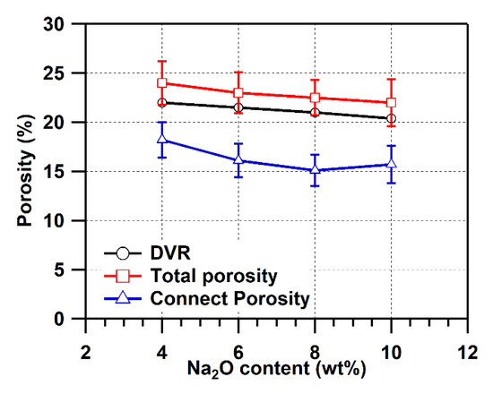 The DVR, total porosity and connect porosity of pervious concrete at 28 days are shown in Figure 18. There are similar trends for the DVR and total porosity measured, with a slightly higher porosity for the latter. The total porosity decreased with the increase in equivalent Na2O content of paste. It is interesting that the trend of total porosity is similar to that of compressive strength of pervious concrete. Usually, the higher porosity indicates lower compressive strength for concrete. These results suggested that the relationship between the compressive strength, total porosity and thickness distribution of paste on the surface of coarse aggregate is more complex than expected. The total porosity from other previous studies ranges from 31% to 45%, with the compressive strength of 1.1–6.45 MPa [55,56]. The pervious concrete in this study had lower total porosity but much higher compressive strength. As suggested by Barnhous and Srubar III [55], the permeability could be sharply increased with porosity when the porosity is over 30% but together with a decrease in compressive strength. The design of pervious concrete is basically a balance between the compressive/tensile strength and permeability.