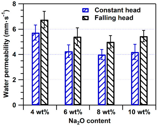 The connect porosity of pervious concrete had a similar trend of total porosity, except that the connect porosity of pervious concrete with paste of 10 wt% Na2O content was slightly higher than that of 8 wt% Na2O content. The connect porosity is a defining factor for the water permeability of pervious concrete. According to the water permeability results of pervious concrete in Figure 19, the water permeability of pervious concrete under both falling head and constant head decreased with the increase in equivalent Na2O content of paste, which agrees well with the trend of connect porosity of pervious concrete. These results are reasonable because water can only permeate through the pervious concrete by the connected pore, which was characterized as connect porosity. There is a correlation between the connected porosity, water permeability and tensile strength of pervious concrete, which all decreased with the increase in equivalent alkali content by up to 8 wt% Na2O and slightly decreased when Na2O content reached 10 wt%. A previous study [34] on the porosity of pervious concrete prepared with geopolymer indicated that the pervious concrete with a total porosity of 24.1–40.2% had connect porosity of 18.4–34.1%, together with a lower compressive strength compared with this study. A higher total porosity usually results in a lower compressive strength for concrete.