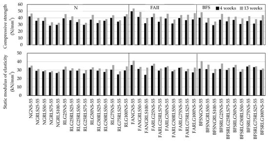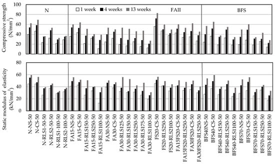 Figure 2 shows that when recycled fine aggregate class L was used, the elastic modulus of elasticity followed the same trend as the compressive strength. It showed a decreasing trend when the replacement ratio of recycled fine aggregate increased. Regarding the effect of mineral admixtures on the increasing trend from 4 to 13 weeks, there was no difference when FA was used as cement and fine-aggregate substitutes, even when the amount of mixed FA was high. However, when BFS was used as BB and BC with the replacement ratios of 40% and 70%, respectively, a stable increasing trend was observed.