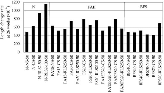 As shown in Figure 3, when recycled fine aggregate class L was used, the length change rate increased as the replacement ratio of recycled fine aggregate increased. Regarding the effect of the mineral admixture, when FAII and BFS (BB or higher) were used, compared with the N specimen groups, the length change rate decreased, even with a high replacement ratio of recycled fine aggregate class L. For BFS, the length change rate significantly decreased because of the increased amount of SO3 in the mortar [33].