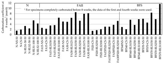 Accelerated carbonation was observed for up to 26 weeks. However, one specimen (BFS70-RLS1100-50) was completely carbonated at four weeks and five specimens (FA30-RLS150-50, FA30-RLS175-50, FA30-RLS1100-50, BFS40-RLS1100-50 and BFS70-RLS150-50) were completely carbonated at eight weeks. Therefore, the carbonation coefficient was examined at eight weeks. Furthermore, for the specimens that were completely carbonated at four and eight weeks, the data of the first and fourth weeks were used, respectively, because the time for complete carbonation could not be specified.