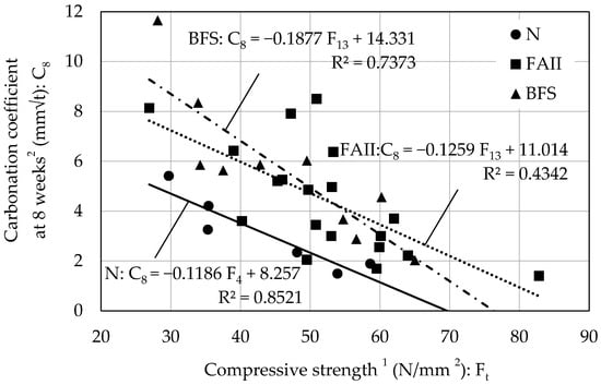 Correlation between compressive strength and carbonation coefficient. 1 Experimental results of N specimens at 4 weeks and FAII, BFS specimens at 13 weeks are shown. 2 For the specimens completely carbonated before 8 weeks, the data of the first and fourth weeks were used.