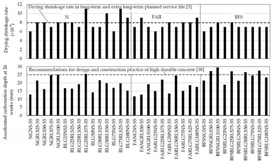 - When the replacement of recycled coarse and fine aggregate class L was each higher than 50%, the drying shrinkage rate increased and carbonation became faster. However, the drying shrinkage rate became lower when BFS was used as the BB type, and carbonation could be suppressed using FAII as a fine-aggregate substitute;
