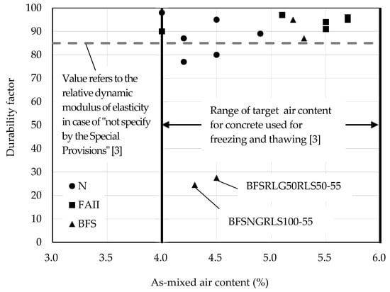 As shown in Figure 8, for the as-mixed fresh concrete, when the target air content of the concrete used for freezing and thawing was 4.0–6.0% (4.5 ± 1.5% and under the limit of air content was 4.0% [3]), regardless of the recycled aggregate replacement ratio, the durability factor was roughly >80, indicating good resistance to frost damage. However, for the BFS specimen groups, when the RLS replacement ratio was of >50%, as in cases of BFSRLG50RLS50-55 and BFSNGRLS100-55, the durability factor was significantly <30. This is because when the replacement ratio of recycled fine aggregate (absorption = ~10%) is 50% and the air content is within the regulated range, the durability factor is ≤60 [39]. In the case where low-quality recycled fine aggregate is used together with BFS, a complex cause is considered.