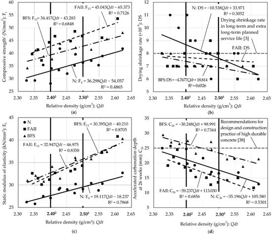 In the relative quality index method, the relative quality index is calculated based on the primary properties of normal and recycled aggregates, such as the absorption and replacement ratio of recycled aggregate. Then, the correlation between the relative quality index and the concrete performance is evaluated. The empirical formula is then derived from the results of past experiments; moreover, a mix proportion with a range of strength is set based on the required thresholds of drying shrinkage rate and carbonation. After being verified in a manufacturing factory, the final mix proportion is determined. Therefore, it is possible to obtain a performance design for concrete in which drying shrinkage and durability were considered [5]. In this study, because FA was used to substitute fine aggregate, the density, which correlates highly with absorption [39,40], was the primary concrete property used to calculate the relative density using Equation (1) based on volume. The correlation between the relative density and concrete main performance was evaluated (Figure 9). Furthermore, regarding the compressive strength, the N specimen groups at 4 weeks and FAII and BFS specimen groups at 13 weeks were evaluated. To clarify the effect of mineral admixtures, a relational expression was obtained for each case of performance and binder type.
