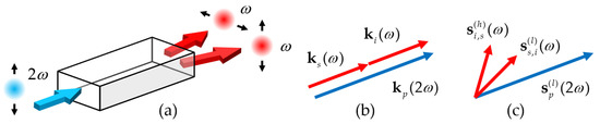 KN is a negative biaxial crystal belonging to the point group of orthorhombic mm2 at room temperature, and its lattice constants are a = 0.56896 nm, b = 0.39692 nm, and c = 0.57256 nm [14,15]. The crystallographic axes (a, b, c) of KN are all perpendicular to each other and have a relationship of (a, b, c) = (y, x, z) with the optical axes. In this case, the order of refractive-index (RI) magnitudes is given by nz < ny < nx. The temperature-dependent Sellmeier equations of KN are found in [16]. Figure 1a illustrates Type II SPDC in a KN, where an input pump photon with a frequency 2ω generates a pair of photons (signal and idler) with the same frequency ω and polarization states perpendicular to each other. The collinear birefringent PM (BPM) is achieved between the wave vectors (k) of the pump, signal, and idler photons as shown in Figure 1b. However, their beam directions (i.e., Poynting vectors, s) are generally not parallel to the crystallographic axes of KN, resulting in a spatial walk-off due to the birefringence as shown in Figure 1c. This spatial walk-off will be discussed further in a later paragraph. The type II BPM condition can be expressed as: