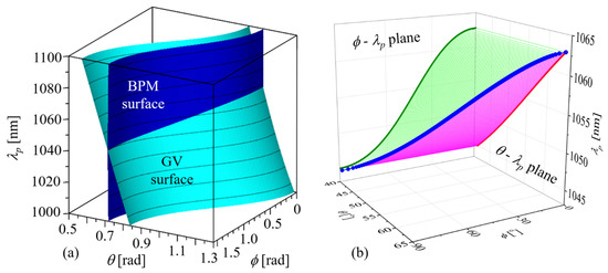 Each subscript g in Equation (7) represents the group index. Now, the Type II EPM shown in Figure 1a is defined as Equations (1) and (7) being satisfied simultaneously. Each of these equations is a function of three variables: the pump wavelength (λp), θ, and ϕ. Therefore, by solving a system of Equations (1) and (7) while changing λp, we can obtain the solution set of θ and ϕ, i.e., the direction of pump wave vector for the Type II EPM at the given λp. Thus, by sweeping the pump wave vector along the direction characterized by the solution set of θ and ϕ, we can continuously tune the resonant λp. This means that the spectral position of a photon pair can be selectively determined or tuned within the range of the solution sets while maintaining the high spectral purity of biphoton states. In contrast, for PPKN, Type II EPM can only be achieved at a single wavelength [18].