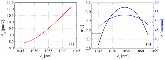 (a) The effective nonlinear optic coefficient (deff); (b) the spatial walk-off angle (w) between the interacting beams, and the beam deviation (Δ). The numerical simulation results were plotted as functions of λp satisfying the Type II EPM.