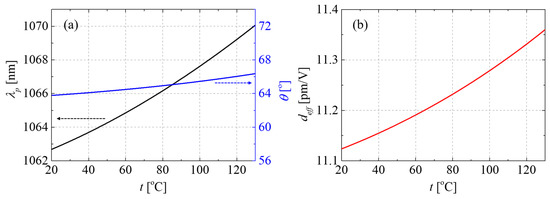 The magnitude of the effective nonlinear optic coefficient (deff) is determined by the BPM direction as described in the paragraphs with Equations (8)–(11). Since the efficiency of SPDC is proportional to the square of deff, it is important to estimate the deff-values for the given direction of wave vectors satisfying the Type II EPM. The deff-values were calculated numerically using Equations (8)–(11), and the results are plotted in Figure 3a as a function of λp. The horizontal width of the graph falls within the full range of λp that satisfies the Type II EPM. In this range, the deff values span 8.40–11.13 pm/V, which are much larger than other cases using the Type II EPM approach, e.g., deff = 1.50 pm/V for BBO under the BPM; 2.39 pm/V (=(2/π)d24) for PPKTP and 2.77 pm/V (=(2/π)d15) for PPLN, under the first-order QPM [10,26,27]. The largest values of deff are 11.13 pm/V at 1062.78 nm, and the corresponding BPM direction is (θ, ϕ) = (63.8°, 0°). It is noteworthy that the deff-value is the largest when the wave vectors for the BPM are parallel to the x-z plane (ϕ = 0). The maximum walk-off angle (w) between the interacting beams and the corresponding beam deviation (Δ) were calculated using Equations (13) and (14), respectively, and plotted together in Figure 3b as a function of λp that satisfies the Type II EPM. Over the whole range of λp, the calculated w value spans 2.64–3.05°. The deviation (Δ) between the interacting beams per crystal of unit millimeter length is 46.10–53.29 μm/mm, which can be sufficiently overcome by using a pump beam of large size in thick crystals. The calculated values of deff, w, and Δ are also summarized in Table 1.