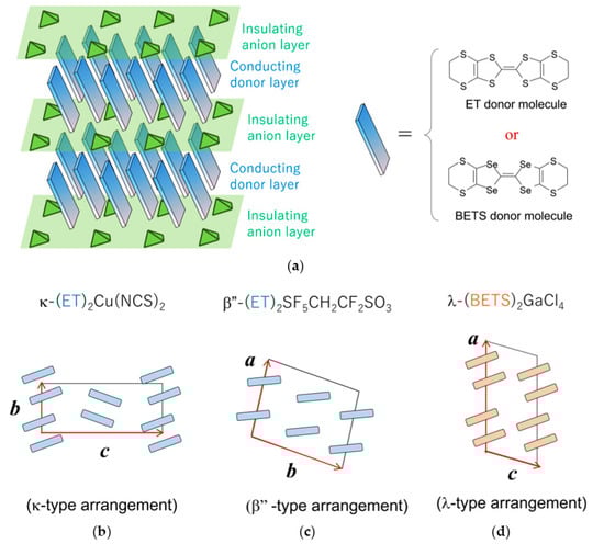 Physics of organic conductors has provided the fascinating and rich issues associated with the low dimensionality and effect of electron correlation [1]. One of the most interesting systems are the layered organic conductors composed of the ET donor molecule, where ET denotes bis(ethylenedithio)tetrathiafulvalene. The ET donor molecules form two-dimensional (2D) conducting layers that are separated by insulating anion layers with a monovalent ion X−. Figure 1a shows schematic structure of ET (or BETS) donor conducting layers and anion insulating layers in a layered organic conductor, where BETS denotes bis(ethylenedithio)tetraselenafulvalene. The molecular structures of ET and BETS are shown in the upper right side of Figure 1a. In layered organic superconductors, there are several types (labeled by Greek letters) in packed ET donor layers. The k-, β″-, and λ-type arrangements in donor layers are shown in Figure 1b–d. In the k type compounds, k-(ET)2X, the measurements of Shubnikov-de Haas (SdH) and de Haas-van Alphen (dHvA) oscillations have elucidated the presence of a well-defined Fermi surface (FS) with simple structures [2]. Moreover. the moderately heavy effective mass revealed by SdH and dHvA experiments suggests that electron correlation plays a significant role on determining the physical properties of the normal state as well as superconducting (SC) state. It was suggested that superconductivity appears in proximity to the antiferromagnetic insulating state in the electronic phase diagram [3,4]. Since some of these unusual physical properties suggest similarities with high-Tc cuprates, many researchers have pointed out that the spin fluctuations play a vital role for the appearance of SC state [5,6,7,8].