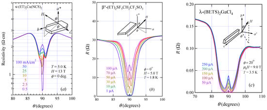 To investigate the in-plane anisotropy of the flux-flow resistance at a constant magnetic field, the resistivity as a function of the angle θ at various fixed ϕ was measured because we can easily find the position of the H parallel to the conducting plane at any ϕ. For example, the interlayer resistivity of k-(ET)2Cu(NCS)2 is shown in Figure 2a [25]. For the magnetic field exactly applied parallel to the conducting plane, the ρ(θ) curve shows a sharp drop due to the SC transition at the lowest current density of 0.5 mA/cm2. It is remarkable that the resistivity at θ = 90° depends strongly on the current density. A sharp peak is clearly observed at θ = 90° for highest current density of 100 mA/cm2. The resistivity for |θ − 90°| > 5° is independent of current density of up to 100 mA/cm2. Thus, the effect of Joule heating is negligibly small. Instead, the sharp peaks are due to the vortex dynamics [25,33,34,35,36,37,38]. Similar features are found for β″-(ET)2SF5CH2CF2SO3 in Figure 2b and λ-(BETS)2GaCl4 in Figure 2c [26,27].
