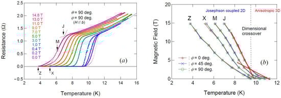 To discuss the in-plane anisotropy of upper critical field, measurements of the interlayer resistance were performed for ϕ = 0° (H // c), ϕ = 45°, ϕ = 90° (H // b). Figure 3a presents the temperature dependence of interlayer resistance for various values of magnetic field applied along the b-axis (ϕ = 90°) up to 14.8 T. Due to a broad transition into the SC state, the following four criteria are used here to extract the SC transition temperature at each magnetic field. These are shown in Figure 3a, where the four criteria of the SC transition temperature: a “junction” TJ, a “midpoint” TM, “a zero resistance extrapolation” TX (ignoring the tail near R = 0), and “zero resistance point” TZ are defined. A similar fashion was confirmed for ϕ = 45° and ϕ = 0° (H // c).