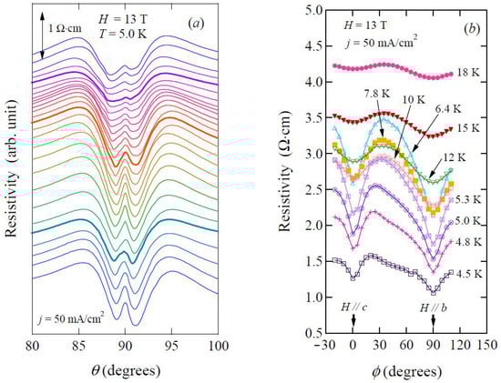 As seen in Figure 4b, the ρ(ϕ) curves seem to be described by a fourfold symmetric origin. Takanaka and Kuboya theoretically showed that the angular variation of the upper critical field is described as Hc2(ϕ) ∝ cos4ϕ in the d-wave superconductivity [43,44,45]. The ρ(ϕ) curves are naively consistent with this theory; the maximum and minimum of Hc2 give the minimum and maximum resistivities, respectively. When dx2−y2 pairing is assumed, Hc2(ϕ) has maxima at ϕ = 0° (H // c) and ϕ = 90° (H // b), and a minimum at ϕ = 45°, whereas dxy pairing leads to Hc2 with maxima and minima reversed with respect to dx2−y2 pairing. Thus, the fourfold symmetry in Figure 3b is not inconsistent with the Hc2 anisotropy originating from the dx2−y2 pairing state. However, detailed magnetoresistance studies at 1.5 and 4.2 K [39] as well as Figure 3 showed the lack of in-plane anisotropy of Hc2. In addition, the cusp-like minima that appear below 7.8 K cannot be represented by a simple cos4ϕ dependence. Thus, another mechanism to describe these oscillation patterns is necessary.