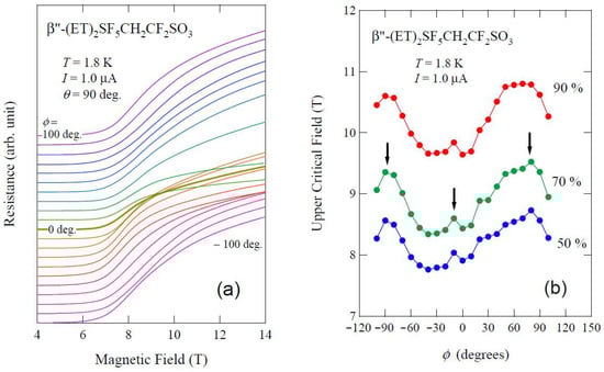 - Yasuzuka, S.; Uji, S.; Terashima, T.; Sugii, K.; Isono, T.; Iida, Y.; Schlueter, J.A. In-Plane Anisotropy of Upper Critical Field and Flux-Flow Resistivity in Layered Organic Superconductor β″-(ET)2SF5CH2CF2SO3. J. Phys. Soc. Jpn. 2015, 84, 094709. [Google Scholar] [CrossRef]