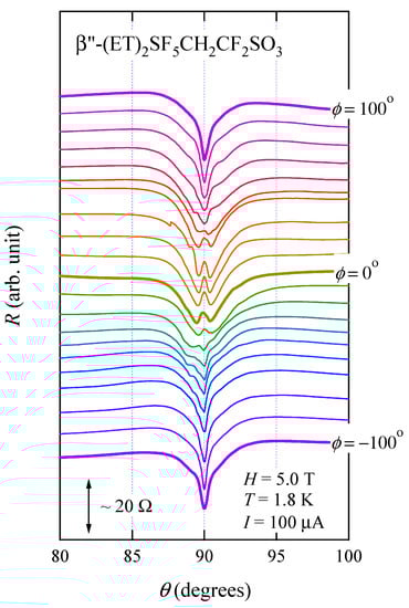 - Goddard, P.A.; Blundell, S.J.; Singleton, J.; McDonald, R.D.; Ardavan, A.; Narduzzo, A.; Schlueter, J.A.; Kini, A.M.; Sasaki, T. Angle-dependent magnetoresistance of the layered organic superconductor κ-ET2Cu(NCS)2: Simulation and experiment. Phys. Rev. B 2004, 69, 174509. [Google Scholar] [CrossRef]