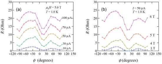 Azimuth angle dependence of the flux-flow resistance for several values of current (a) and of magnetic field (b). (Reprinted from [27]. Copyright 2015 The Physical Society of Japan.)