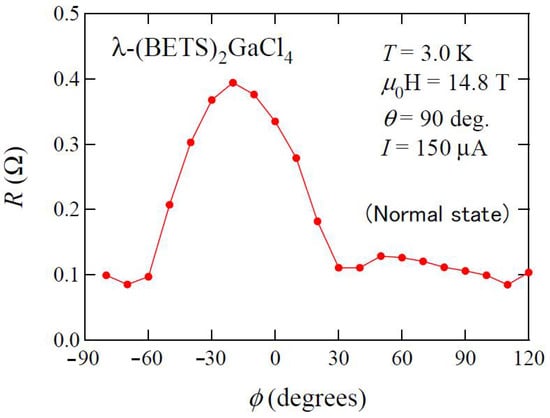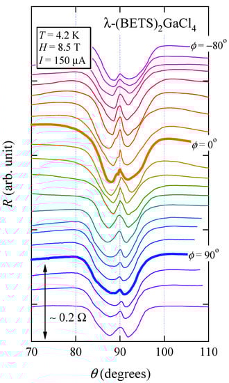 Azimuth angle dependence of normal-state magnetoresistance in λ−(BETS)2GaCl4 within the conducting plane. (Reprinted from [26]. Copyright 2014 The Physical Society of Japan.)