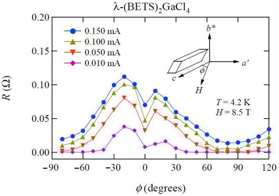 Azimuth angle dependence of flux-flow resistance in λ−(BETS)2GaCl4 at various currents. A sharp minimum is observed at ϕ = 0° (H // c). (Reprinted from [26]. Copyright 2014 The Physical Society of Japan.)