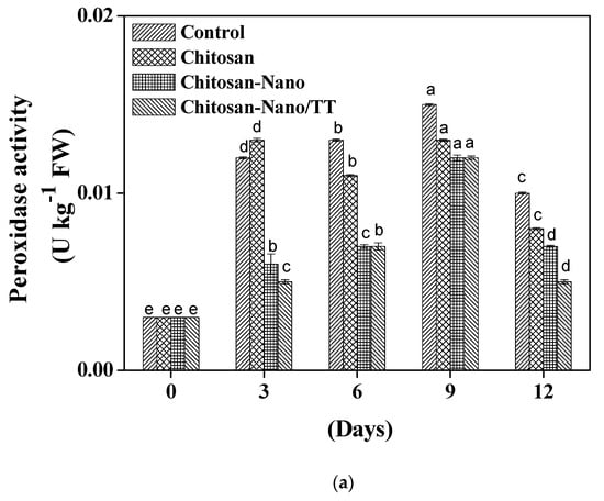 Antioxidant enzymes such as peroxidase, superoxide dismutase, and catalase play a vital role in the defense of the mushroom oxidation [22,23]. The mushroom quality started to deteriorate after the third day of storage due to oxidative enzymes that negatively influence taste, color, and smell. Figure 2 presents the quality characteristics of the chemical constituents during the storage period. Clear differences were noticed between various coating films. In Figure 2a, the highest activity of peroxidase was for the control samples (0.010 U kg−1 FW) and followed by Chitosan as (0.008 U kg−1 FW), while Chitosan-Nano/TT film reported the lowest activity (0.005 U kg−1 FW) on day 12. Sami et al. [18] and Li et al. [24] reported that oxygen is required for the oxidation activities’ occurrence; thus, the use of nano-films on blueberries could explain the peroxidase activity reduction.