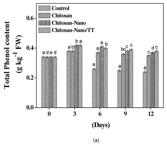 Figure 3a shows that the total phenol content of mushroom samples reported an increasing trend during the storage period after coating treatments, while the control samples were stable during the third day of the entire storage (0.38 g kg−1). Chitosan-Nano/TT treated mushrooms had a significantly increased total phenol content (p < 0.05) at the end of the storage period. Phenylalanine ammonia-lyase enzymes in mushrooms have an important role in raising the phenolic contents [10,28]. Cold conditions also help in raising the total phenol content by changing the phenolic metabolism [6]. Results recommend that Chitosan-Nano/TT treatment may maintain the total phenol contents’ accumulation in the mushroom that can alleviate the browning processes.