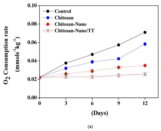 The reduced respiratory metabolism increases the shelf-life of the stored products. The changes in respiration rates after coating treatments are presented in Figure 4. Figure 3a,b show that O2 consumption and CO2 production rates increased in response to the storage period at 4 °C. The effect was further noticed with the increase of the storage time. The O2 consumption rate continued to increase especially for uncoated samples and Chitosan films to reach (0.071, 0.058 mmol s−1kg−1, respectively), while Chitosan-Nano/TT and Chitosan-Nano films remarkably reached the lowest values (0.026, 0.035 mmol s−1kg−1, respectively) at the end of the storage period. Mild heat was recently used for decreasing the O2 production rate on fresh-cut Agaricus bisporus mushrooms [34].