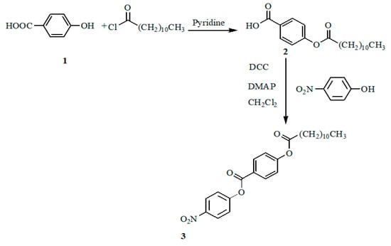 In a new one-pot methodology to synthesize our target organic LC compound (3) in excellent yield, 4-(dodecanoyloxy) benzoic acid (2) was allowed to react with 4-nitrophenol in the presence of a catalytic amount of dicyclohexylcarbodiimide (DCC) and 4-(dimethylamino) pyridine (DMAP) in a dry DCM with stirring at room temperature, as shown in Figure 1. This approach takes advantage of the DCC binding with water, and further, the formation of an easily removable product, dicyclohexylurea. The structural features of compound (3) were established by 1H NMR, IR and mass spectral data. The IR spectrum displayed absorption bands attributable to two νC=O ester groups at 1759 and 1735 cm−1 and the disappearance of the νOH band. The 1HNMR spectrum proves the presence of the C11 tail. It was found that compound (2) was obtained upon the reaction of 4-hydroxybenzoic acid (1) with acid chloride, namely, lauroyl chloride in dry pyridine. The IR spectrum showed a broad peak centered at 3402 due to the νOH and νC = O ester and νC = O acid at 1757 and 1685 cm−1, respectively. 1H NMR displayed two doublet signals at 8.15 and 7.23 ppm for Ar-H with J coupling = 8.8 Hz; two triplet signals at 2.58 and 0.88 ppm for COCH2 and CH2CH3, respectively; and two multiplet signals at 1.79–1.64 ppm and 1.38–1.27 ppm, for COCH2CH2 and 8CH2, respectively. The organic LC compound (3) had been previously prepared [25] in a multistep process via the conversion of 4-(dodecanoyloxy) benzoic acid (2) to its corresponding acid chloride, then with 4-nitrophenol.