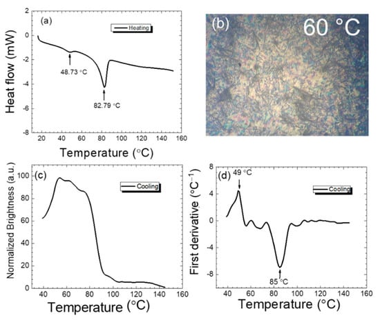 The formation of the liquid crystal phase is temperature-dependent for many synthesized compounds and contains many sub-phases throughout the transformation by heating, from a completely ordered crystalline phase and eventually to a completely disordered isotopic phase at which the clearing temperature, TC, is obtained. Measurement of the phase transition temperatures and the clearing temperatures allows researchers who are interested in thermotropic LC materials to exploit them in applications that require a wide range of operating temperatures and a clearing temperature as far as possible from room temperature so as not to be affected by climate temperature changes. In this work, the heat flow of the prepared sample, which is the heat power absorbed by the LC sample during the change of temperature, showed a single intermediate phase, and the measured phase transition temperatures were 48.73 °C at the transformation from the crystal phase to the LC phase, and 82.78 °C at the transformation from the LC phase to the isotropic phase, as shown in Figure 2a. To check the mentioned results, another study, based on the optical measurement of the images of the LC textures captured during the transformation, was performed during the cooling rate process (Figure 2b). The resultant captured images were processed to quantify the transmitted brightness, which is the average of the pixel values at each single temperature, as shown in Figure 2c.