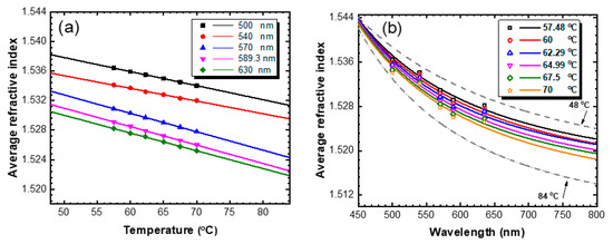 (a) Dependence of average refractive index on the temperature at different wavelengths: the experimental data are presented as symbols, and the solid lines are the linear fitted lines based on Equation (3). (b) Dispersion of the average refractive index at different temperatures: the experimental data are presented as symbols, and the solid lines are the fitted curves based on Equation (1).