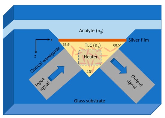 Figure 4 depicts the design of the proposed sensor. A groove is made inside a glass substrate in the shape of a triangle and filled with the LC material to form a liquid crystal prism (LCP). The anchoring surface strength inside the LCP groove is not supported with the commonly used aligning material and the LC molecules do not have a unified orientation to show the average refractive index for the propagating light waves. Two optical waveguides are embedded inside the glass substrate in direct contact with the LCP, in order to send the input signal and receive the output signal. A thin metallic film is placed at the LCP base and the analyte solution is allowed to flow inside a designed channel at the other side of the metallic film. A heater is positioned at the top and the bottom of the lateral surfaces of the LCP. The optical response of the three-layer configuration (LC/metallic film/analyte solution) is described by the reflectivity (R), which can be calculated from the three-layer Fresnel equation of transverse magnetic (TM) plane waves as [30]: