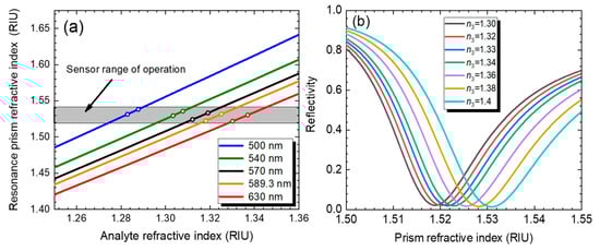 (a) The resonance prism refractive index vs. the analyte refractive index at 500, 540, 570, 589.3, and 630 nm. (b) The shift in the reflectivity dip corresponding to different analyte refractive indices at a wavelength of 630 nm.