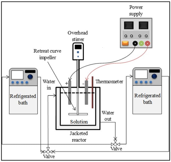 The experimental setup for electrocrystallisation is shown in Figure 2. The rig consisted of a 250 mL jacketed reactor attached to two programmable refrigerated baths so that the desired temperature of the solution for the crystallisation and dissolution process could be effectively achieved. In all the experiments, the volumes of the solution used were 200 mL and mixing of the solution was carried out by a glass retreat curve impeller. During polythermal crystallisation, only one refrigerated bath was used, and the second refrigerated bath was used for isothermal crystallisation so that sudden quenching of the solution could be achieved. In all experiments, two carbon electrodes were immersed in the solution at a depth of 3 cm and placed 5 cm apart while facing each other. Prior to this, the electrodes were cleaned by immersion in acetone, and then rinsed with distilled water and dried in an oven at 40 °C. A direct current was supplied to the solution from the beginning of the experiment until the end of the experiment. The current voltages used for polythermal crystallisation were 5 V (1 V/cm) and 9 V (1.8 V/cm), whilst for isothermal crystallisation, the electric potentials used were 5 V (1 V/cm) and 20 V (4 V/cm). All the experiments were repeated three times to ensure reproducibility.