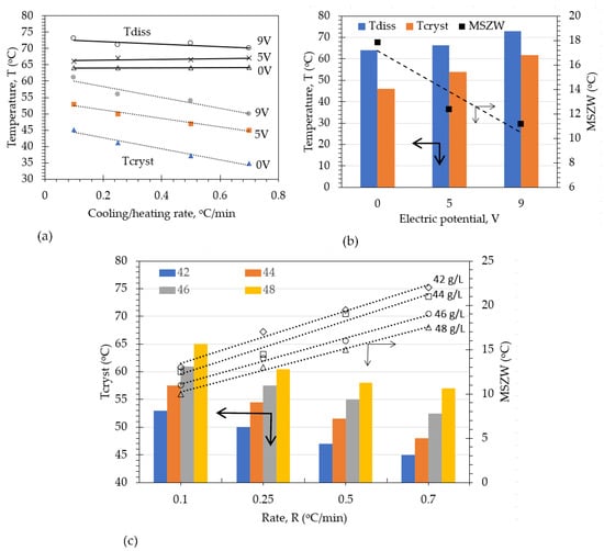 (a) Temperature of dissolution, Tdiss (shown by the solid line), and temperature of crystallisation, Tcryst (shown by the dashed line), for a solution concentration of 42 g/L with the presence of various electric potentials. Data for 0 V were extracted and recalculated from the data presented by Azmi et al. [], (b) Tdiss, Tcryst, and metastable zone width (MSZW = Tdiss − Tcryst) of L-isoleucine extracted at an infinitesimally slow rate (R ≈ 0 oC/min) from the intercepts at the y-axis of Figure 4a, representing data at equilibrium. (c) Relationship between the Tcryst, solution concentration and MSZW when a 5 V electric potential was applied to the solution.