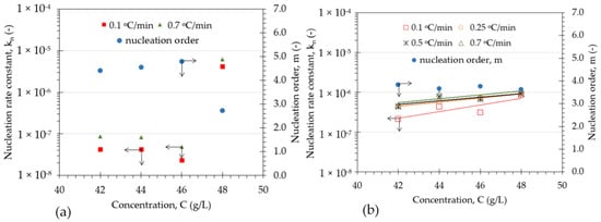 Nucleation order and nucleation rate constant of L-isoleucine in solution with various heating/cooling rates for (a) 0 V and (b) 5 V. The plotted values for 0 V were calculated from data obtained from Anuar and co-workers [,]. The blue dots in both figures represent the nucleation order, m (secondary axes).