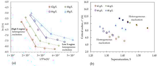 Figure 5a shows the relationship between the time taken for the solute to nucleate (τ, the induction time) and the solution supersaturation with the presence of 5 V electric potential. The underpinning theory involving the calculation in this section is detailed in the Supplementary Materials, Section S3. The relationship produces two distinguishable lines representing regions of the nucleation mechanism. This finding is consistent with the results reported by previous researchers [,] on the existence of the breaking line in the induction time plot, associated with nucleation at low and high supersaturations. Nonetheless, each solution concentration has its supersaturation boundary, ranging between 1.32 and 1.43 (marked by vertical dash lines). The boundary differentiates the type of nucleation mechanism in the solution, in which the nucleation is formed through a heterogeneous nucleation mechanism in solution with high supersaturation, whilst the homogeneous nucleation mechanism dominates in solutions with lower supersaturation [,].