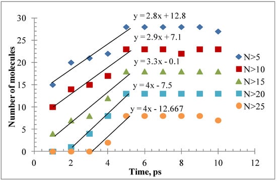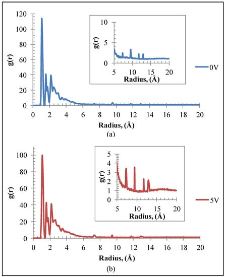 Prediction of nucleation rate and its associated parameters was carried out by analysis of every frame of the simulation, which was also used by previous researchers [,]. The analysis was carried out to obtain the RDF for L-isoleucine molecules where the structural changes for the molecules in the cell were calculated. Figure 9 shows the RDF graph for 0 V and 5 V for the concentration of 44 g/L at a supersaturation ratio of 1.48 and at 50 ps time frames. In Figure 9a,b, strong peaks were present mainly in the region of radius less than 4 Å. In general, peaks of the RDF curve that lies within 3.5 Å are caused by the hydrogen bonding and also chemical bonding, while the curve that lies outside of 3.5 Å comes from the van der Waals and Coulombic interactions [], which in this case is consistent with the result in Figure 9. The nucleation parameters were determined through further analysis of these data for the calculation of the number of molecules present within the pre-determined vicinity. The data were extracted from all the visible peaks in Figure 10 for the radius range between 5 Å and 20 Å. The insets in Figure 9 are examples of the small peaks, which will need to be included in the calculation. The number of molecules present within a predetermined threshold (n) were calculated from the integral of Equation (16) (see Supplementary Materials, Section S5), which gives the number of molecules encloses between two spheres, which is the volume occupied between two adjacent radii. This technique, which is known as the Yasuoka–Matsumoto method [] requires the total number of molecules at a radius from the central atom (denoted as N > number of molecules) collectively added to the number of smaller radii that were previously identified. Figure 10 shows the number of molecules calculated within the radius vicinity from the central atom, denoted as N > number of molecules associated with the radius from the central atom.