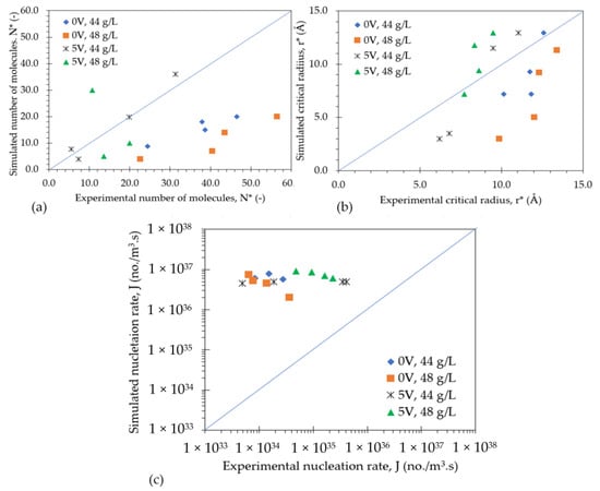 The slope of the plot was divided by the volume of the cell and was equal to the nucleation rate. The number of molecules starts to level off when the aggregated molecules do not increase in size, and this is when the nuclei reach the critical size of r*. From Figure 10, the number of molecules seems to be constant at a simulation time of 5 ps for all boundary sets for the total number of molecules. For instance, for N > 20 at 5 ps, there are 13 molecules of L-isoleucine available between N > 20 and N > 25. The boundaries of N > 20 and N > 25 were determined based on the two enclosed radii from Figure 9. For N > 20, the slope of the data set before it became constant was four (see the linear equation for the slope). Dividing this number by the volume of the cell gives the critical number of molecules, N*, associated with the critical radius equal to 40 molecules, and the r* equal to 9.55 Å. The data for each of the conditions in this simulation were extracted, and the results are shown in Figure 11. Comparison between simulated and experimentally derived N* values (Figure 11a) shows good agreement, particularly for the 44 g/L solutions with a 5 V electric potential. The rest of the systems show that the experimental N* values are higher than the predicted values. For r*, most of the simulated values were within the same range as the values determined experimentally by the isothermal crystallisation technique (see Figure 11b). Further analysis of the data shows that the predicted nucleation rate, J, was on average 300-fold higher than the experimentally determined J. The same observation was made by Shim et al. [], where the simulated value for the nucleation of ammonium perchlorate was higher than the experimental result. This has shown that the conditions and parameters used in the simulation can predict the values for both N* and r* but overpredict the nucleation rate of the isothermal process. This could be because the nucleation conditions obtained using molecular modelling were simulated in a prescribed process (i.e., for the nucleation of ammonium perchlorate was higher than the experimental result), whilst the experimental result was calculated based on real solution conditions. The real solution conditions could mean that nucleation can be affected by homogenous, heterogenous, and secondary nucleation, which were not considered in this system.