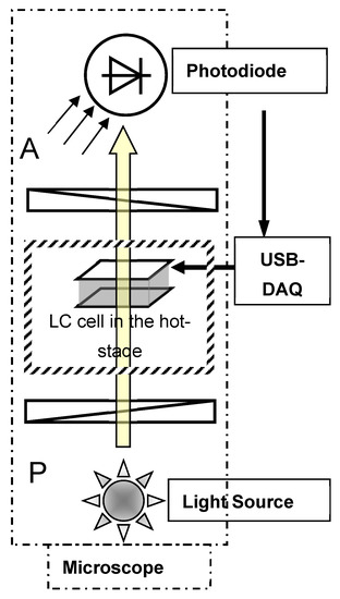 This set-up uses a Polariser (P) and an Analyser (A) of a polarising microscope in which P and A are crossed with each other. A Centronic OSD15-E Visible light Si photodiode is mounted in the camera port of the microscope, connected to a home-made current (I)/Voltage (V) converter, as shown in Figure 1. The signal from the photodiode is proportional to the light intensity transmitted through the crossed polarising system. The output is digitised by a data acquisition board (DAQ, National Instruments USB-6216) and transmitted to a PC. Analyses of the response signal from the sample are carried out by PC software to determine the amplitude and phase of the harmonics of the input waveform. The waveform applied is synthesised by the same DAQ board and, if necessary, amplified by a high-voltage amplifier based on APEX PA85 chip. The output from the DAQ (DC and different harmonics) is fed to an oscilloscope with 4 different channels for the visual observations of the response signal [16].