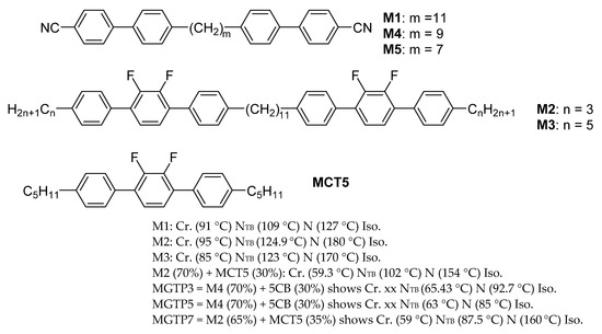 We investigated compounds M1, M2, M3 and 70%/30% w/w mixtures of M4 with a prototypal nematic 4-4’ pentyl cyano-biphenyl (5CB). Compounds M1 and M4 are cyano-biphenyl-based bimesogens. These have methylene spacers of 11 and 9 carbon atoms, respectively, and are often identified as CBC11CB and CBC9CB, respectively. We also investigated compounds M2 and M3, often referred to in the literature as DTC3C11 and DTC5C11, and their mixtures mixed with their monomers in the ratios of weight/weight (w/w) percentage of bimesogen/monomer. These are termed as MGTP3 and MGTP5. For convenience, we continue naming these materials as performed previously. Both M1 and M4 contain cyano-end groups attached to the biphenyl in its para position at each end. When these molecules are bent and twisted, the relative permittivity along the long molecular axis is higher than normal to it. These materials thus exhibit positive dielectric anisotropy (Δε). However, compounds M2 and M3 have fluorinated terphenyl groups, and the resultant dipole moment of the terphenyls lies in a direction normal to the molecular axis. These materials consequently exhibit negative Δε, and its magnitude depends on the net dipole moment. The phase transition temperatures of the mixture can be controlled to an extent by the dilution of the bimesogen with its monomer. The chemical formulae and the structure of the compounds used are given in Figure 2.