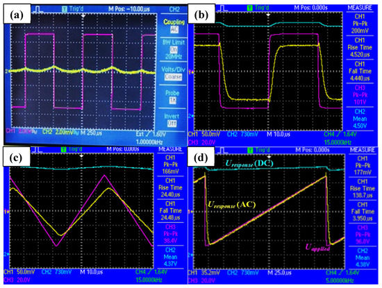 Oscillograms of the electro-optical response in the N and NX phases of M2. Channels: Magenta—applied voltage, Yellow—AC-coupled photodiode signal, Blue—DC-coupled photodiode signal. (a) The response from a planarly aligned cell in nematic phase, the amplitude of signal applied: 10 Vpeak to peak. The maximum output is ~ 1mV, arising presumably from the defects in an LC cell. (b) Square waveform of amplitude 101 Vpeak to peak applied to the cell in the NX phase, the output peak to peak: 200 mV, rise time (response signal rising from 10% to 90% of the final value) is 4.52 μs. The fall time (response signal falling from 90% to 10%) is 4.40 μs. The DC output mean voltage: 4.5 V, (c) the response of LC cell to a triangular waveform in the Nx phase: peak to peak input signal 38.4 V, output is a linear response of amplitude 166 mV peak to peak, DC component 4.37 V. (d) Response from a linear voltage sweep of 38 V applied, the output: linear, and peak to peak is 177 mV, fall time: 3.95 μs.