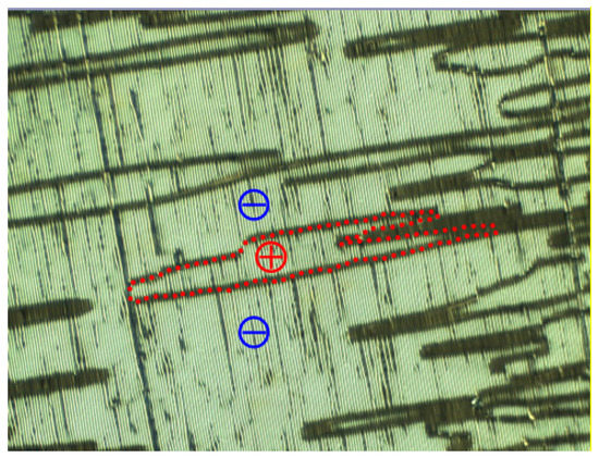 A 2 μm commercial (ECH®, Japan) planar-aligned cell in the NX phase [16]. Stripes observed are parallel to the rubbing direction. Discontinuities in the stripe pattern indicate the domain boundaries of opposite chirality. Identification of the chirality became possible via application of an electric field. The area marked by red dots corresponds to the domain of a single chirality, for example.