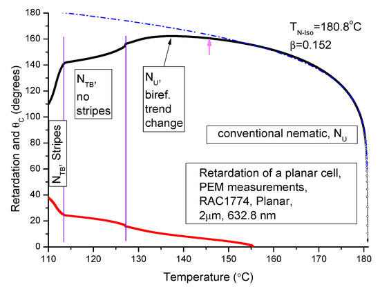 Here, is the measured birefringence value at a temperature of interest. Δnextr is the extrapolated value at this temperature provided the transformation from N to NTB had not occurred. Δnextr is obtained from Haller’s formula [37]: