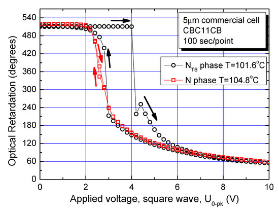 In terms of the differences in the characteristics of the two phases, the Fréedericksz transition is investigated for both N and NTB phases of a planar-aligned cell. The optical retardation (OPR) is measured using a photo-elastic modulator (PEM) system [14] following an application of square waveform across a commercial parallel-rubbed planar-aligned cell of sample thickness 5 μm. The cell is filled with the cyanobiphenyl bimesogen CBC11CB (M1). The dielectric anisotropy for both N and NTB phases is finite and positive. The amplitude of a square waveform is first increased, and then decreased gradually. Each measurement point is fixed to have 100 s delay time inserted in the computer program of an automated measurement procedure to eliminate the contribution to the output from an increased viscosity of the system. Hence, the experiment takes a time span of approximately 5 h to complete. The samples in the LC cell are chemically stable over a longer period. The experimental data, recorded just ~0.5 °C below the N–NTB phase transition, are plotted in Figure 6 as a function of applied voltage. For temperatures much below the N–NTB phase transition temperature, a manifold increase in the viscosity of the material makes this experiment almost impossible to conduct.