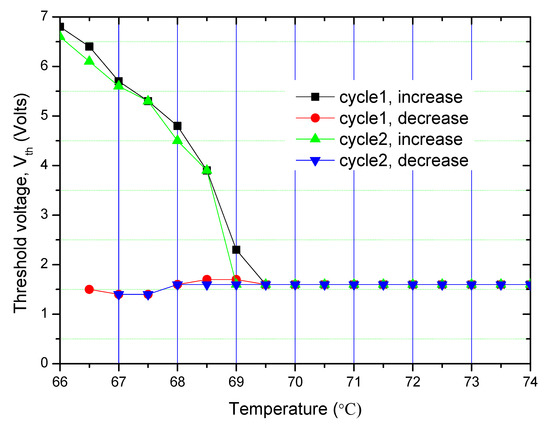 The threshold voltage (Vth) plotted as a function of temperature for the Fréedericksz transition. First cycle: Vth for the square wave amplitude increasing is plotted as black squares, Vth for the amplitude decreasing is plotted as red circles. Second cycle: Vth for both increasing and decreasing amplitudes of the square waveform are shown by green ‘up’ and blue ‘down’ triangles, respectively.