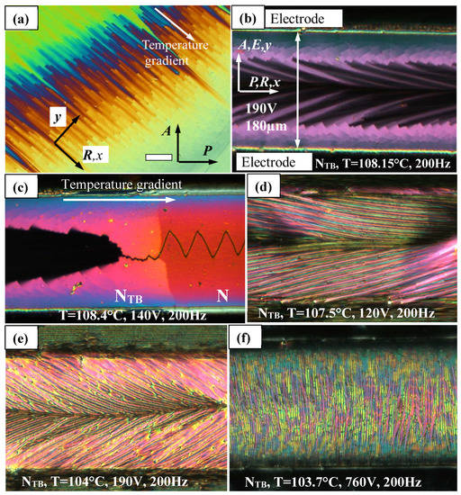 Fascinating images can be obtained using in-plane electrodes in planar rubbed cell (Figure 8b–f) by applying a variety of voltages in the vicinity of the N–NTB phase transition. Once again, sharp change is visible between switched (bright color) and non-switched states (dull color) demonstrate the first order of the transition (Figure 8b,c). Difference between the phases is clearly visible due to a small temperature gradient present in Figure 8c. When cooling the sample with a voltage applied, the self-deformation striped pattern appears with the stripes extending at an angle to the original rubbing direction (Figure 8d–f). Since for this material dielectric anisotropy is positive, this is one more confirmation that the stripes develop along the average director. Finally, for large fields, Figure 8f, the stripes are observed parallel to the electric field.