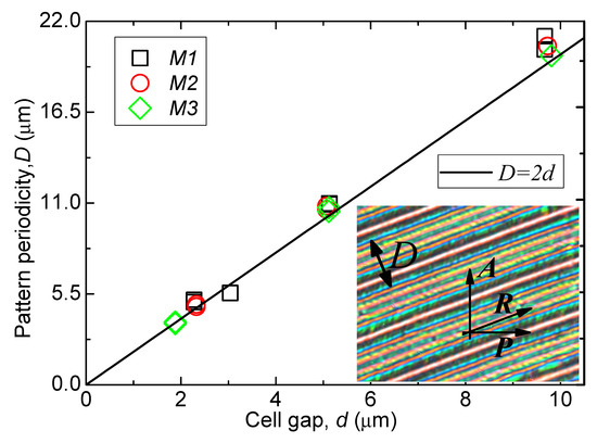 Pattern periodicity plotted as a function of the cell gap varying from 2 to 10 µm. A cell for each thickness is planarly aligned and similarly prepared. Materials used are M1, M2 and M3. The inset in the figure shows beautiful stripes [15].