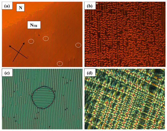 Due to the presence of a small temperature gradient in the cell, the top part of Figure 11a is at the highest temperature and is in the N phase. Some stripes discontinue (fork defects are created at places marked by white circles), this provides a space for the increase in the periodicity of the pattern at lower temperatures. The plot demonstrating detailed temperature dependence of the stripe periodicity in twisted cells is shown in Figure 12.